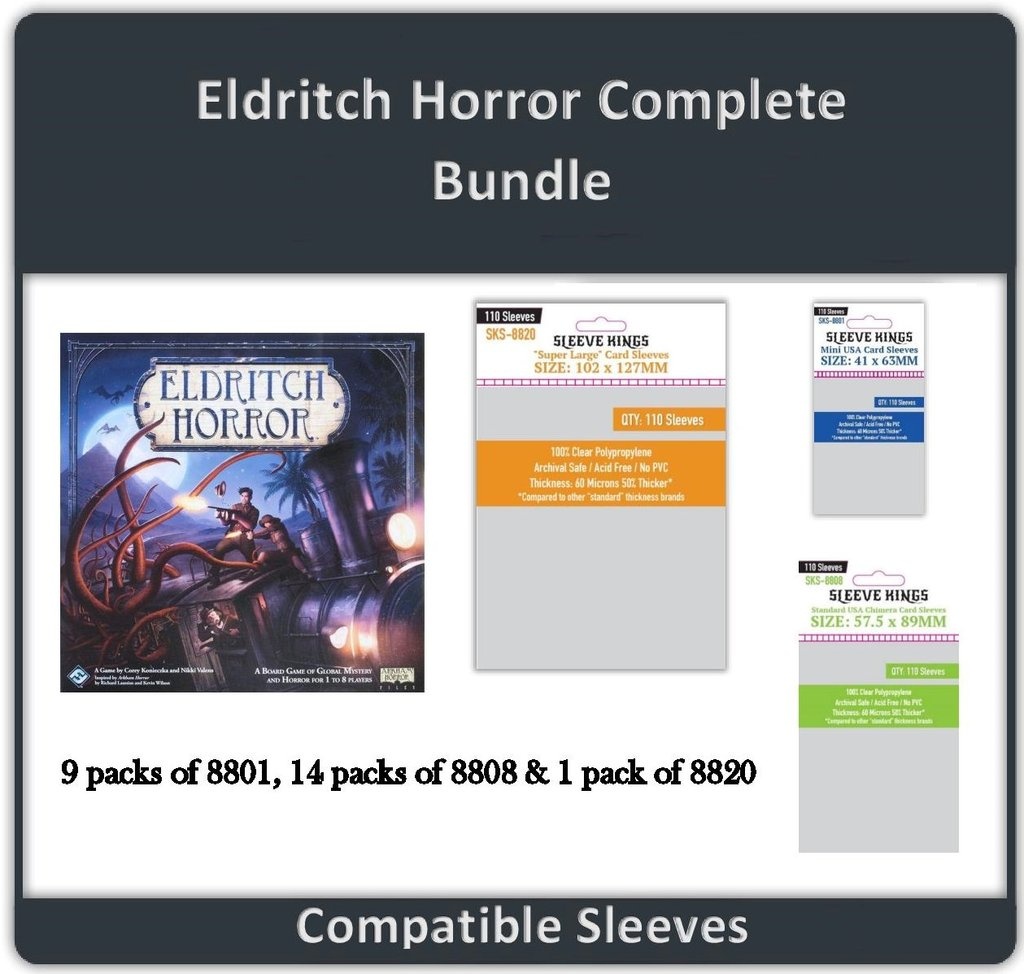 This is the COMPLETE bundle of sleeves needed for Eldritch Horror + all Expansions! Note there are 189 + 126 + 184 + 168 + 210 + 120 + 126 + 200 + 186 = 1509 Standard Cards and 889 Mini Cards for this game. Because our sleeves come 110 per pack you only need 14 packs of standard and 9 packs of mini sleeves to sleeve EVERYTHING! Also now features 1 pack of 8820 for the large cards.