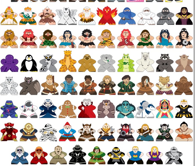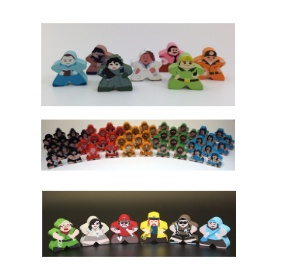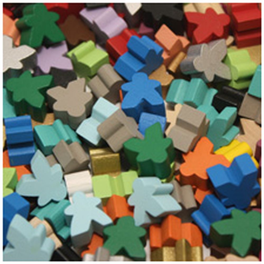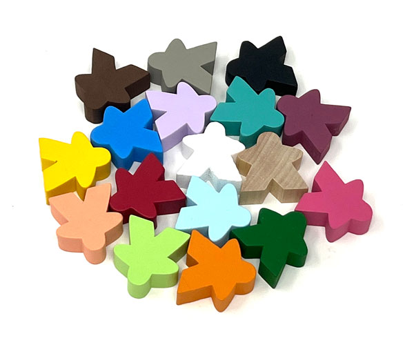 We sell wooden meeples in 4 different sizes and a range of colours.